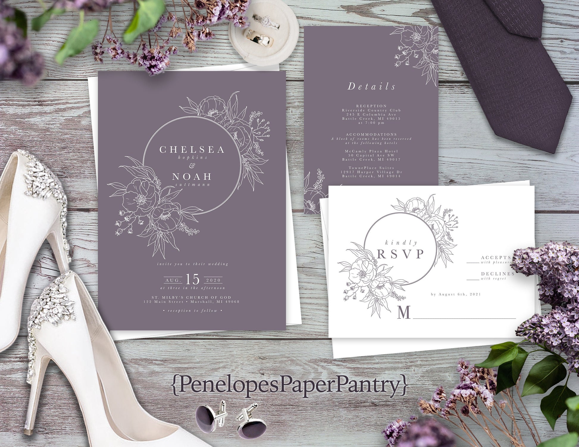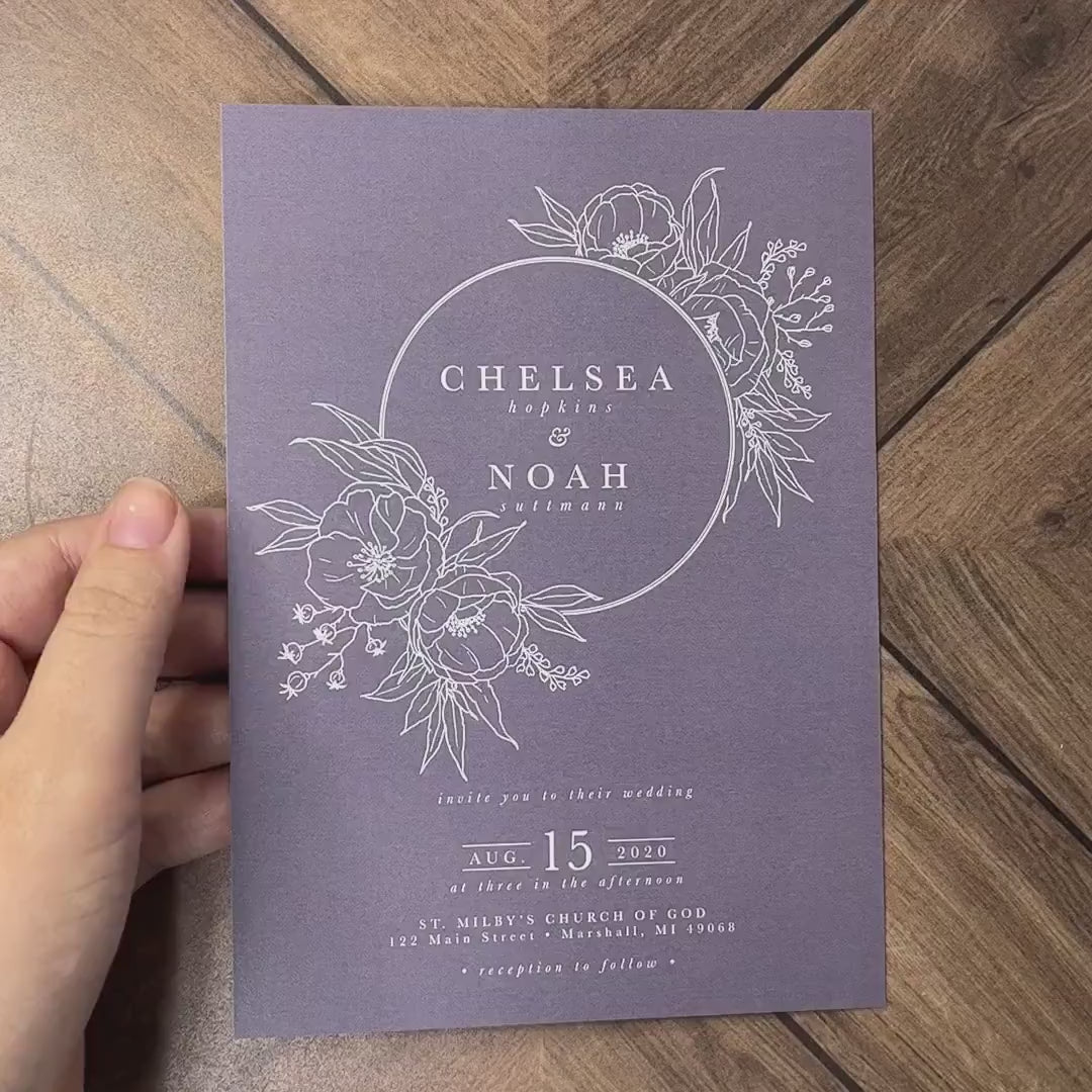 Elegant Dusty Purple Floral Summer Wedding Invitation Personalized Floral Silhouette Wreath Printed Invitations Envelope Included Simple