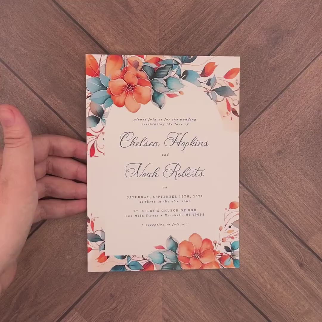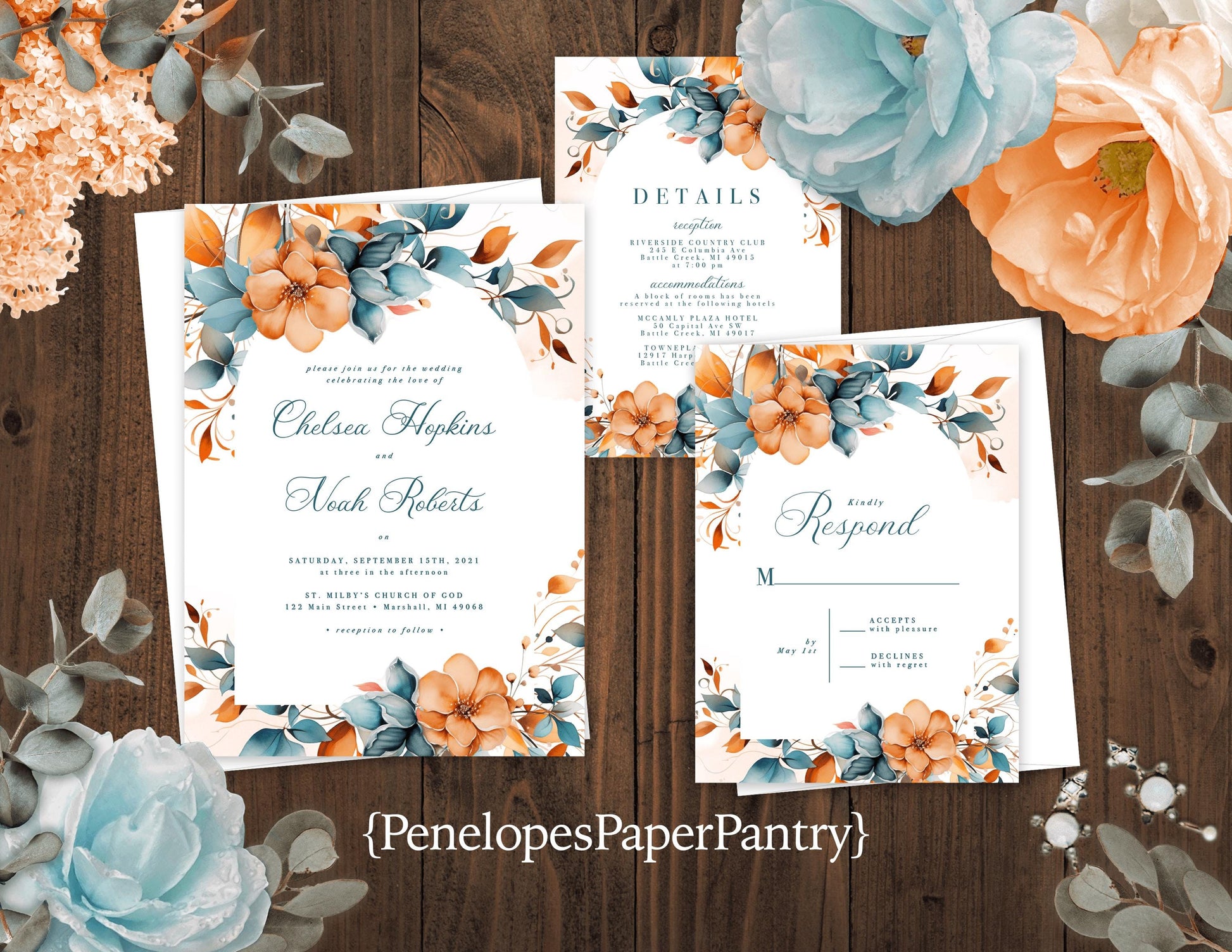Elegant Floral Fall Wedding Invitation Personalize Teal Orange Calligraphy Printed Invitations Envelopes Included Fancy Optional RSVP Card