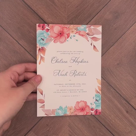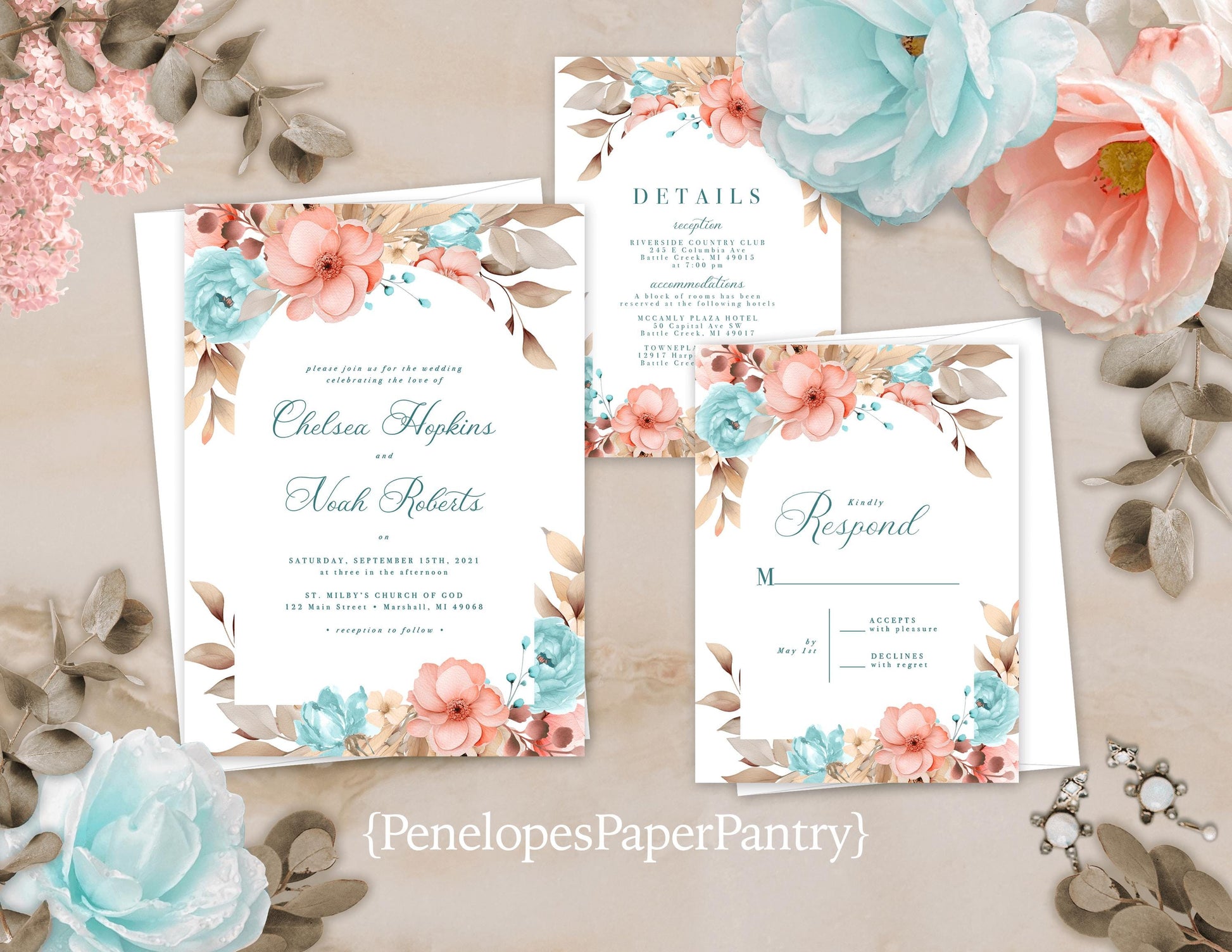 Elegant Floral Summer Wedding Invitation Personalized Teal Coral Roses Calligraphy Custom Text Printed Invitations Envelopes Included RSVP