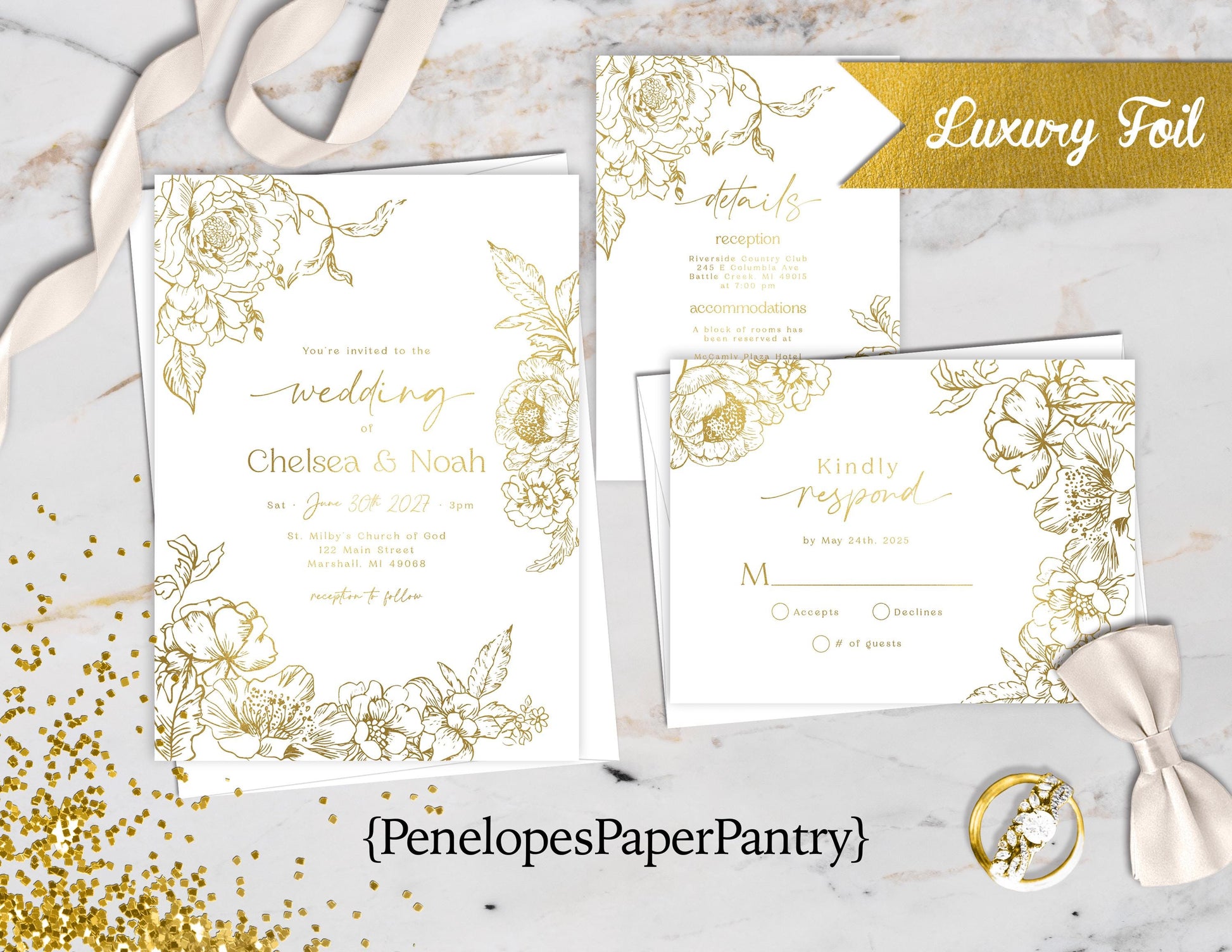 Elegant Floral White and Gold Foil Summer Wedding Invitation Personalized Custom Text Calligraphy Printed Invitations Envelopes Included