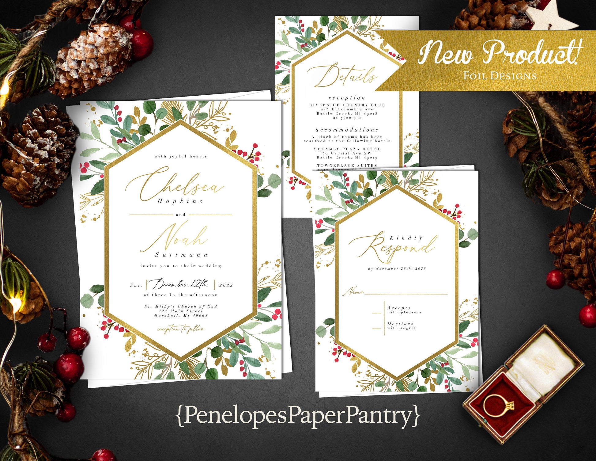 Wedding Invitations by Penelope’s Paper Pantry – Elegant Winter Wedding Invitation with Mistletoe, Geometric Frame & Gold Foil Calligraphy