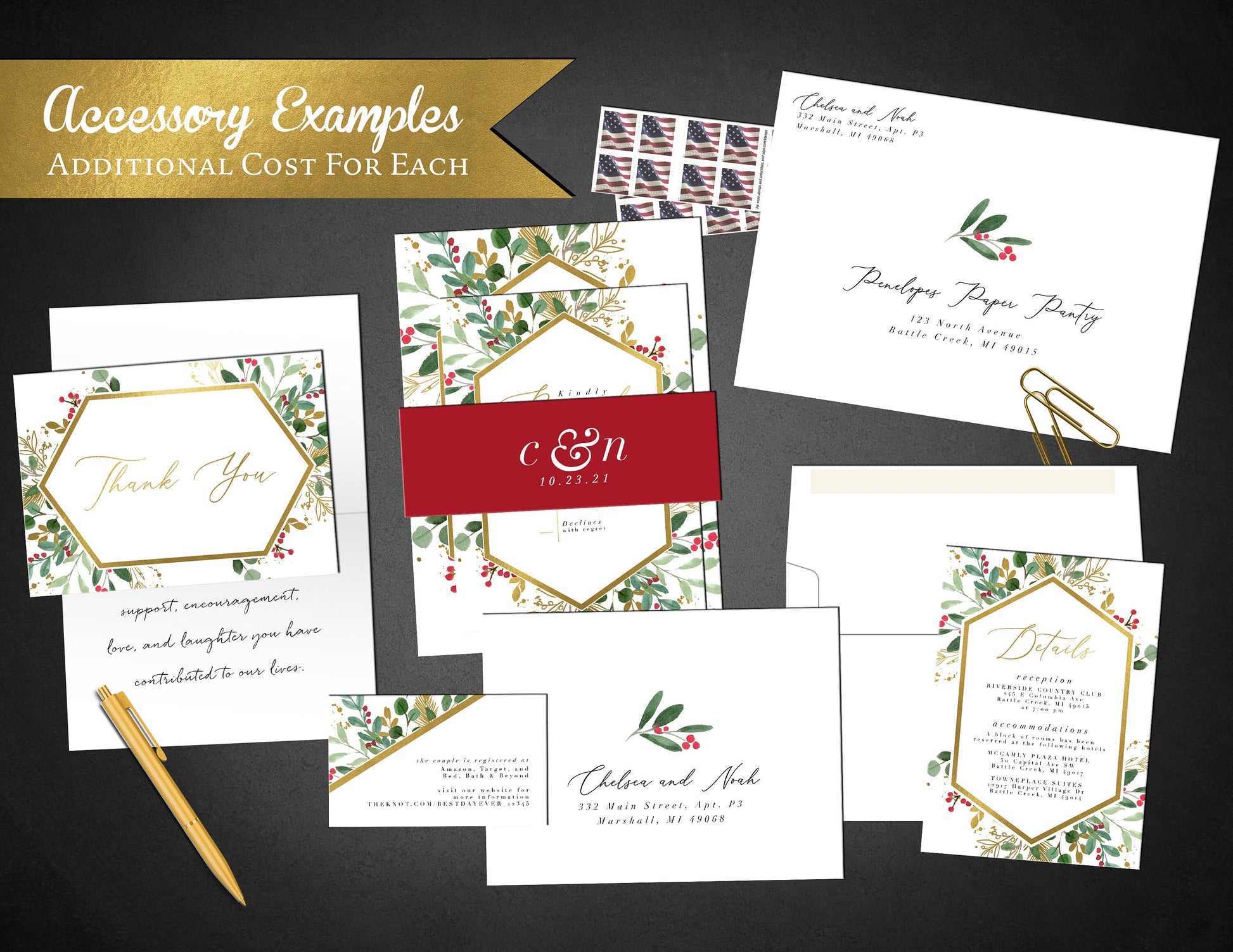Elegant Winter Wedding Invitation – Mistletoe, Geometric Frame, Gold Foil Calligraphy, Custom Text Printed with Envelopes Included
