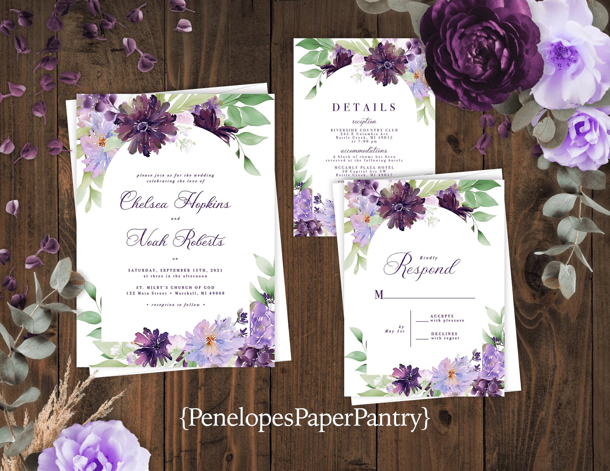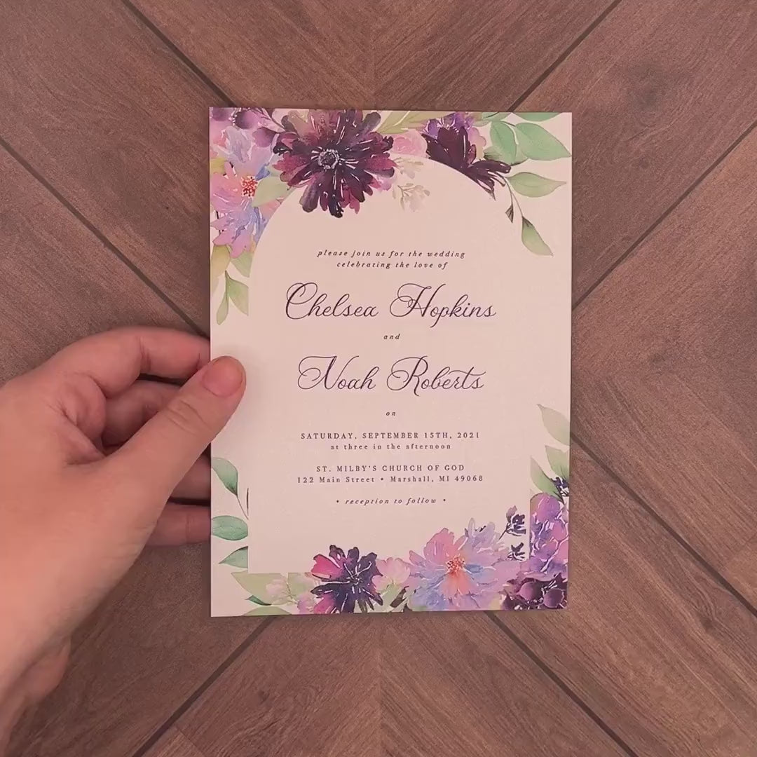 Elegant Purple Floral Summer Wedding Invitation Personalized Lavender Dark Purple Calligraphy Shimmery Printed Invitations Envelope Included