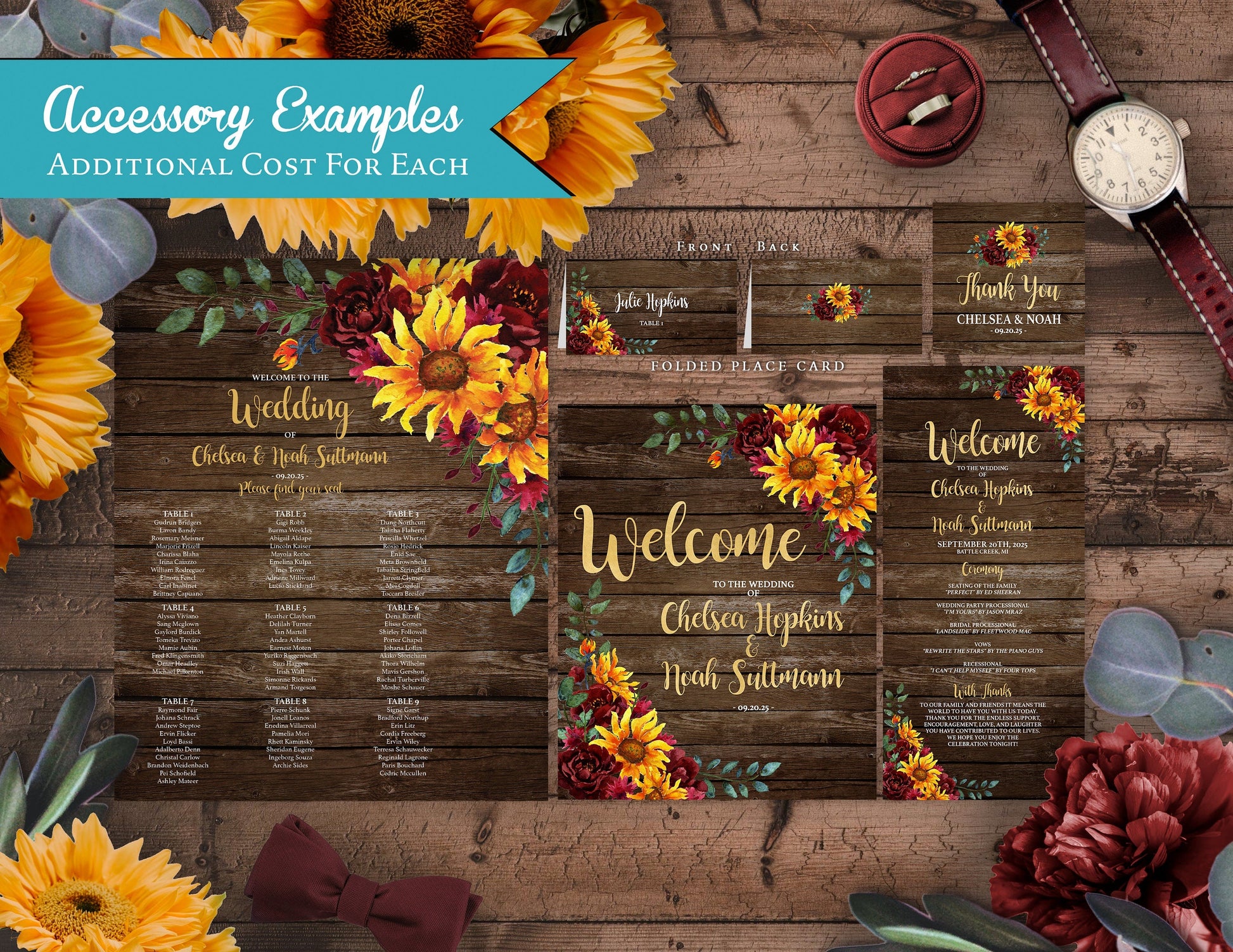 Rustic Fall Wedding Invitation – Sunflowers & Burgundy Roses, Barn Wood & Gold Calligraphy – Personalized Shimmery Printed Invitations with Envelopes Included