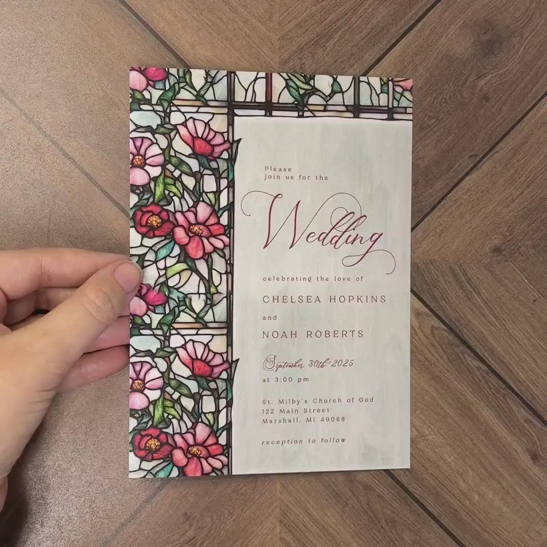 Elegant Stained Glass Floral Summer Wedding Invitation Personalized Calligraphy Shimmery Printed Invitations Envelope Included Optional RSVP
