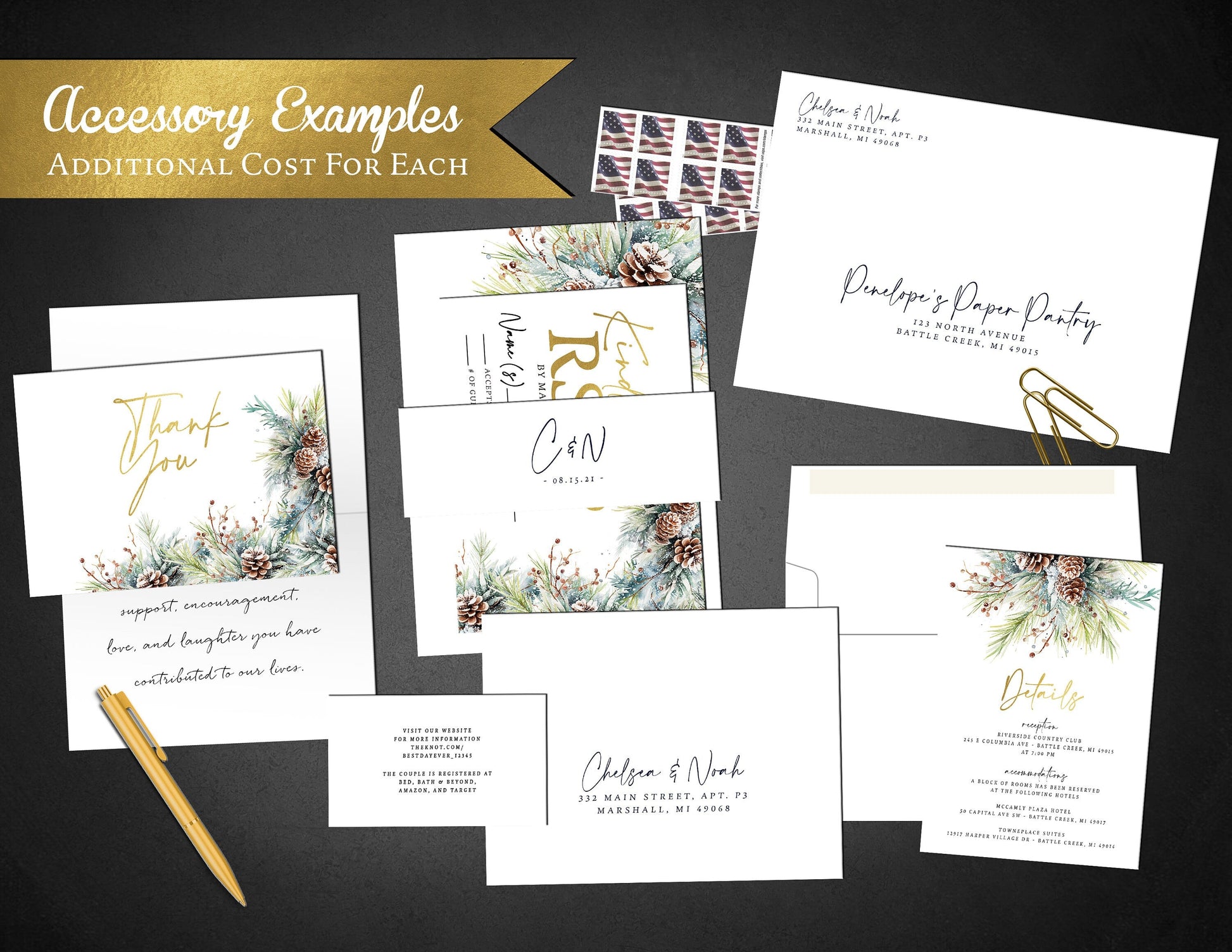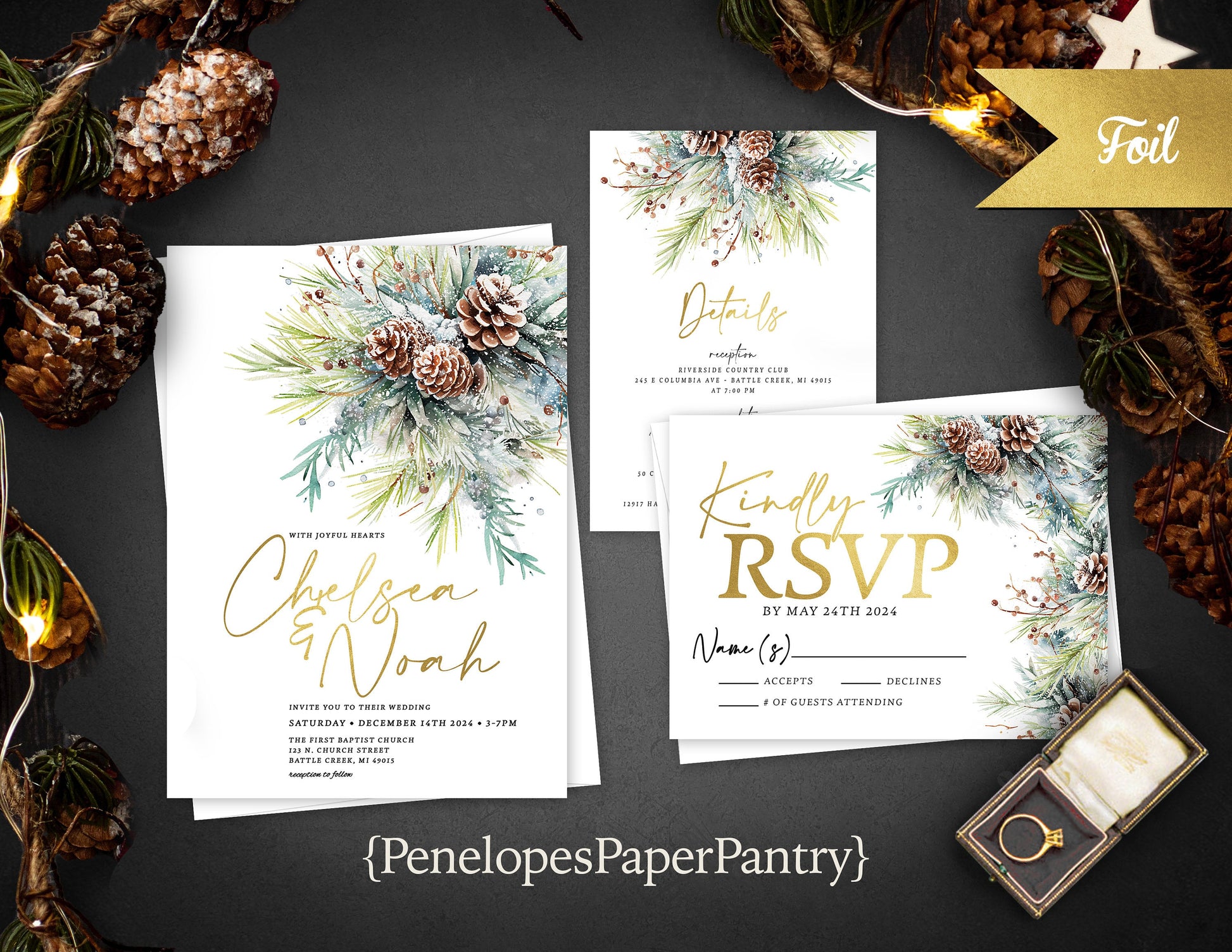 Wedding Invitations by Penelope’s Paper Pantry – Fancy Winter Wedding Invitation with Pine Tree Branches, Pine Cones & Gold Foil Calligraphy