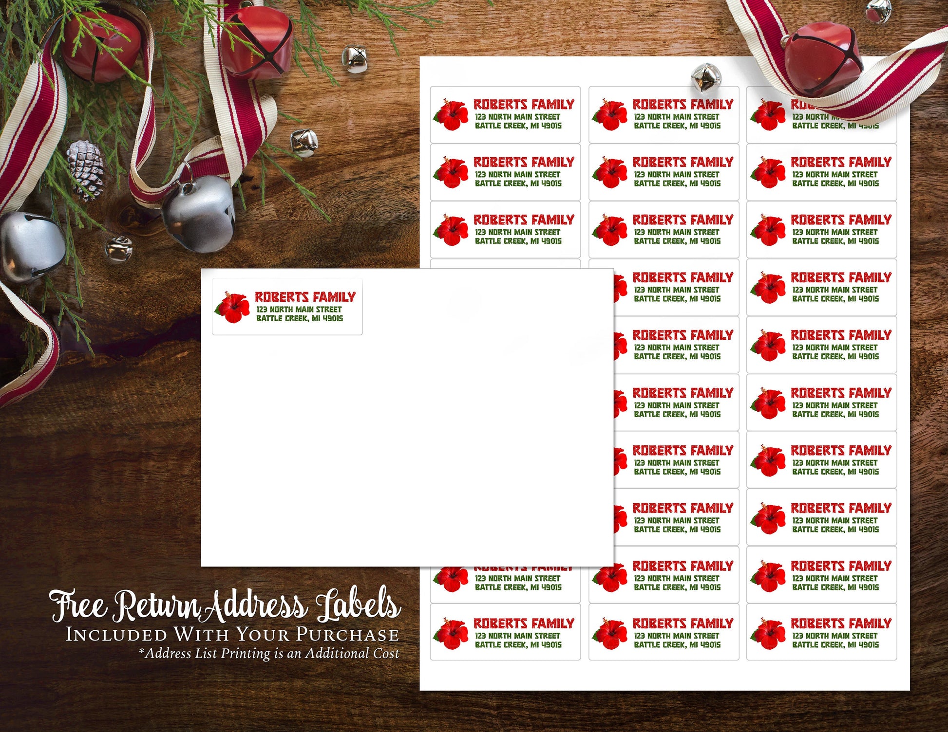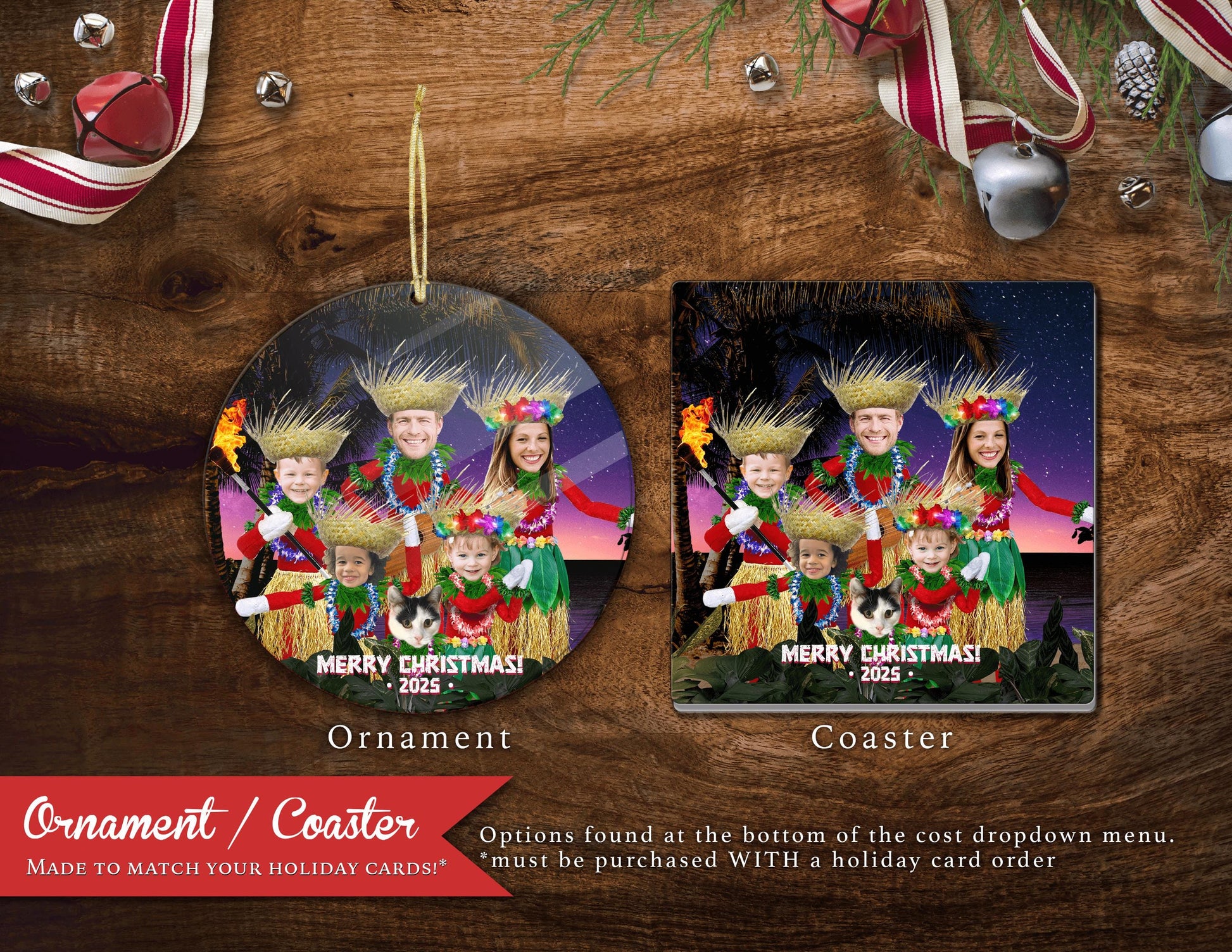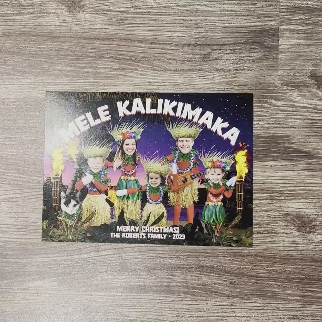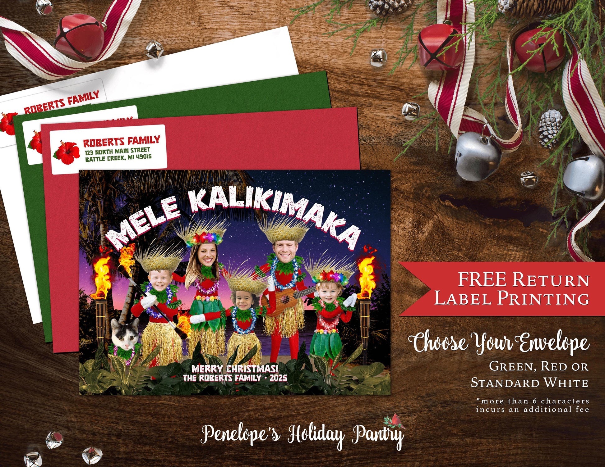 Funny Mele Kalikimaka Christmas Family Photo Card Personalized Hawaiian Luau Grass Skirt Custom Text Printed Cards Envelopes Return Labels