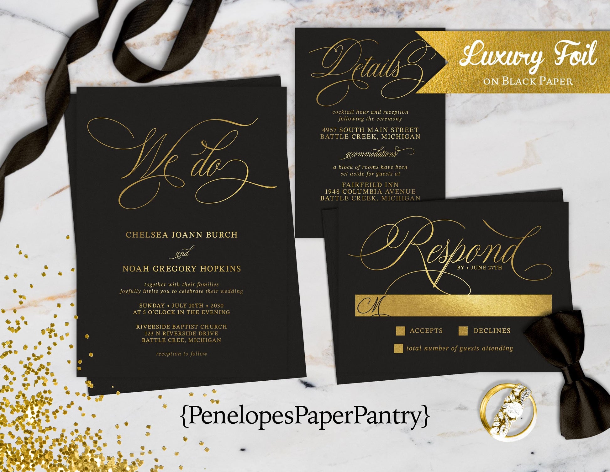 Luxury Gold Foil Typography on Black Paper Traditional Wedding Invitation, Sets, or Suite