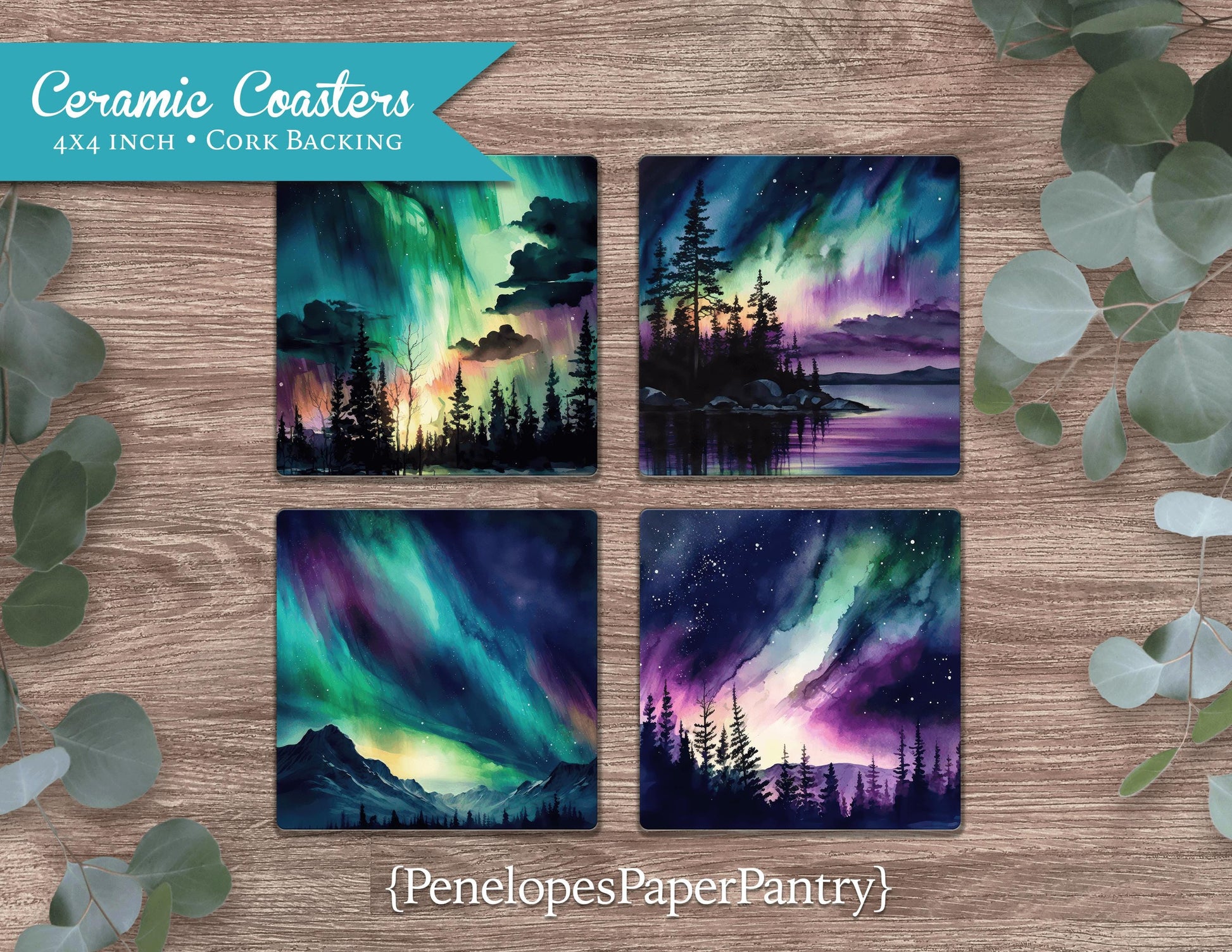Northern Lights Set of 4 Ceramic Coasters with Cork Back