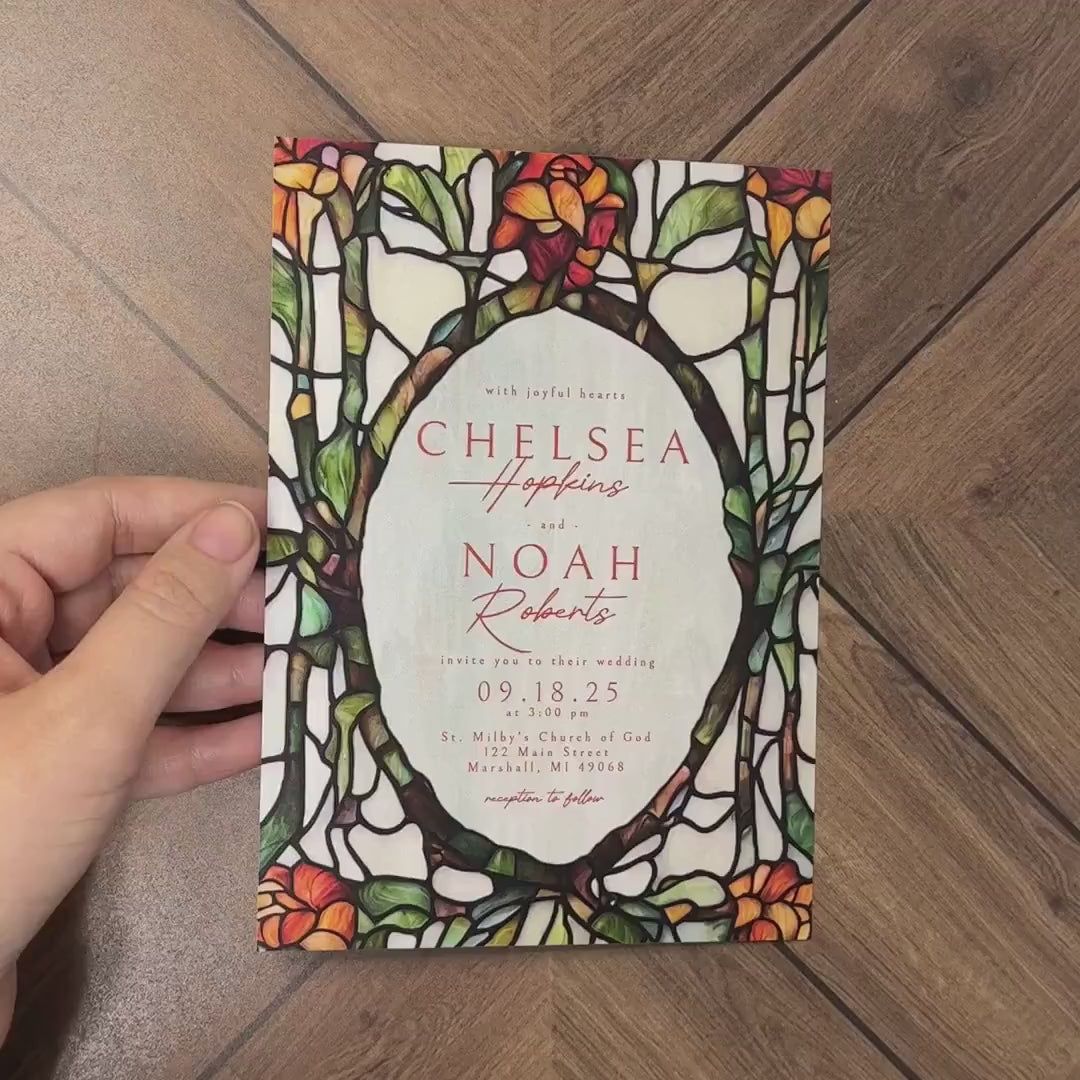 Oval Stained Glass Wedding Invitation,Stained Glass Wedding Invite,Stained Glass Theme,Floral Stained Glass,Shimmery,Envelope Included