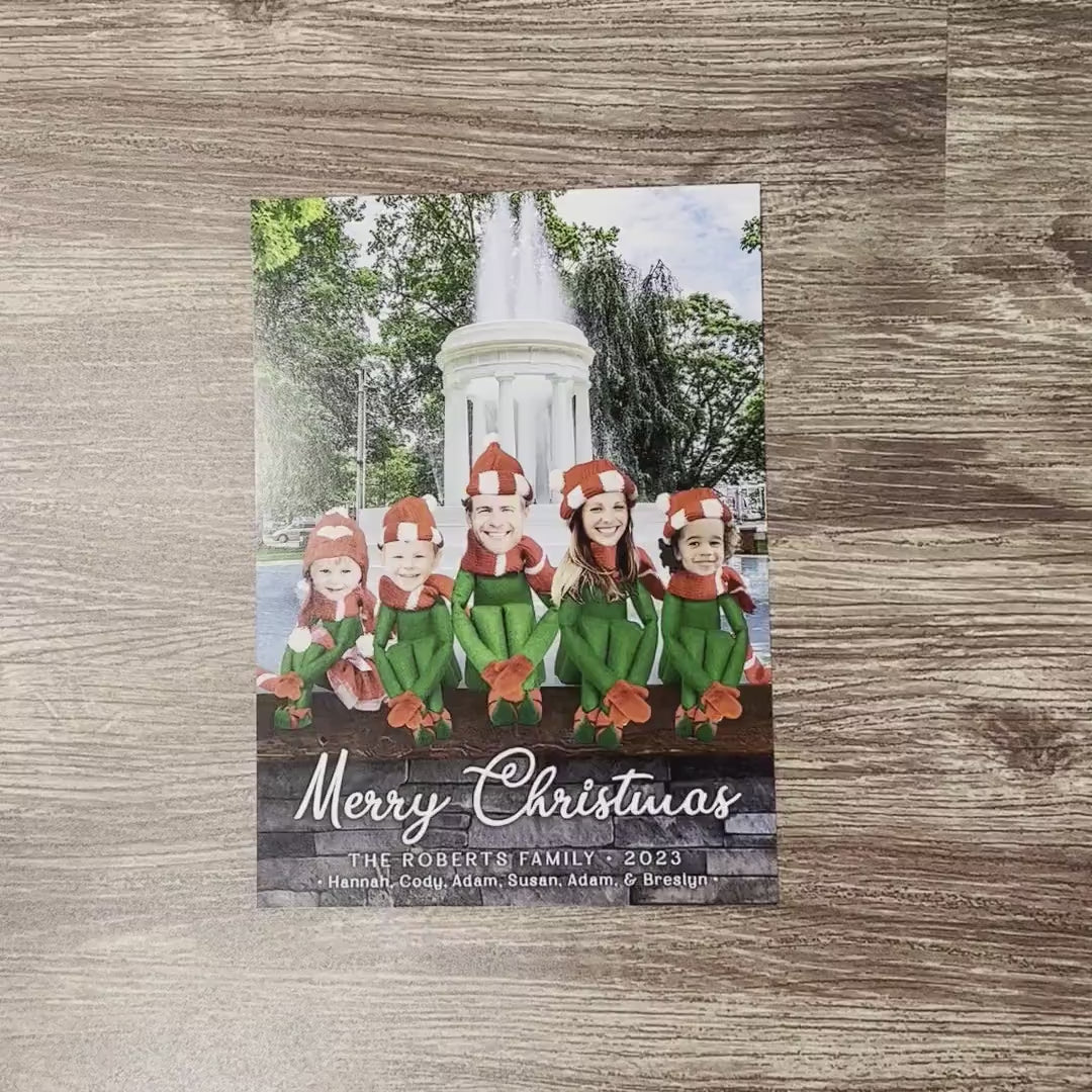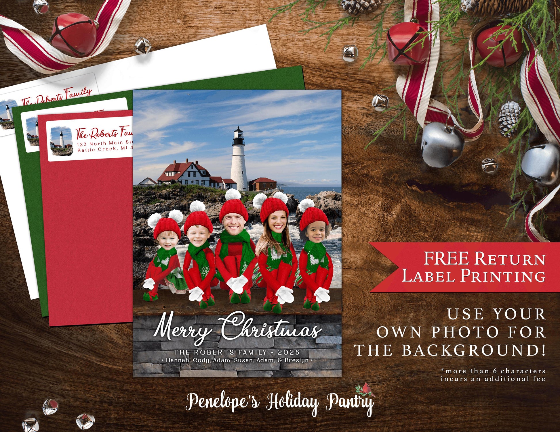 Personalized Funny Elf Family Christmas Photo Card with Custom Background Printed Cards Envelopes Unique Return Address Label