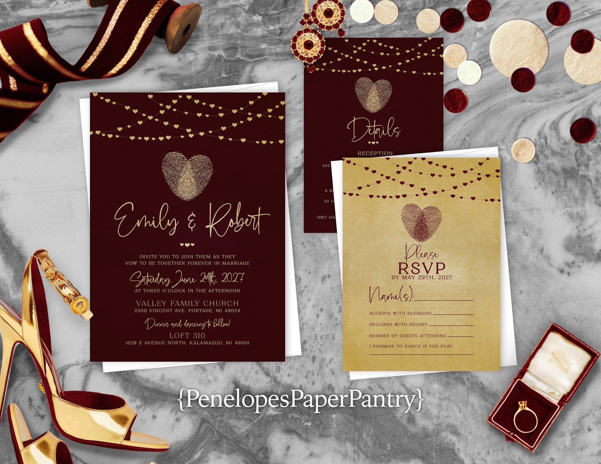Burgundy Thumbprint Heart on Metallic Gold Paper Traditional Wedding Invitation, Sets, or Suite