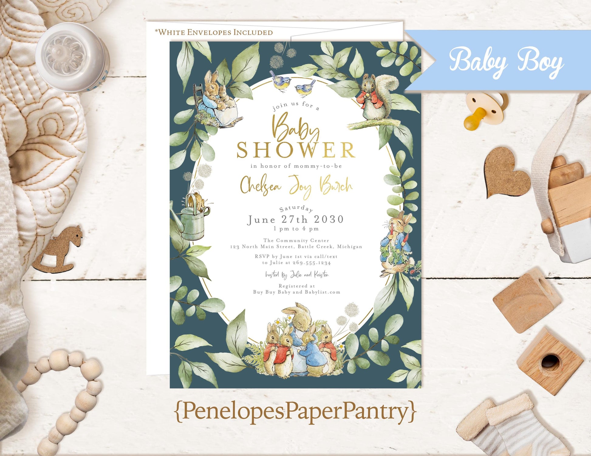 Peter Rabbit Baby Shower Invitation – Personalized Blue Slate & Greenery Design with Gold Foil – Printed Bunny Invite for Couples Shower with Envelopes by Penelope’s Paper Pantry