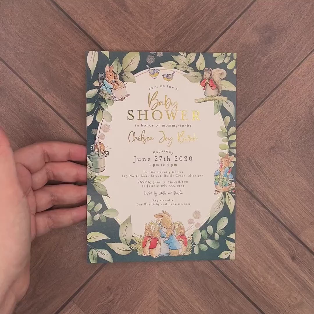 Host a charming and elegant couples baby shower with this beautifully crafted Peter Rabbit invitation, featuring classic bunny artwork, soft blue slate tones, delicate greenery, and eye-catching gold foil accents. This gender-neutral design blends vintage charm with modern sophistication — perfect for celebrating the parents-to-be in style.