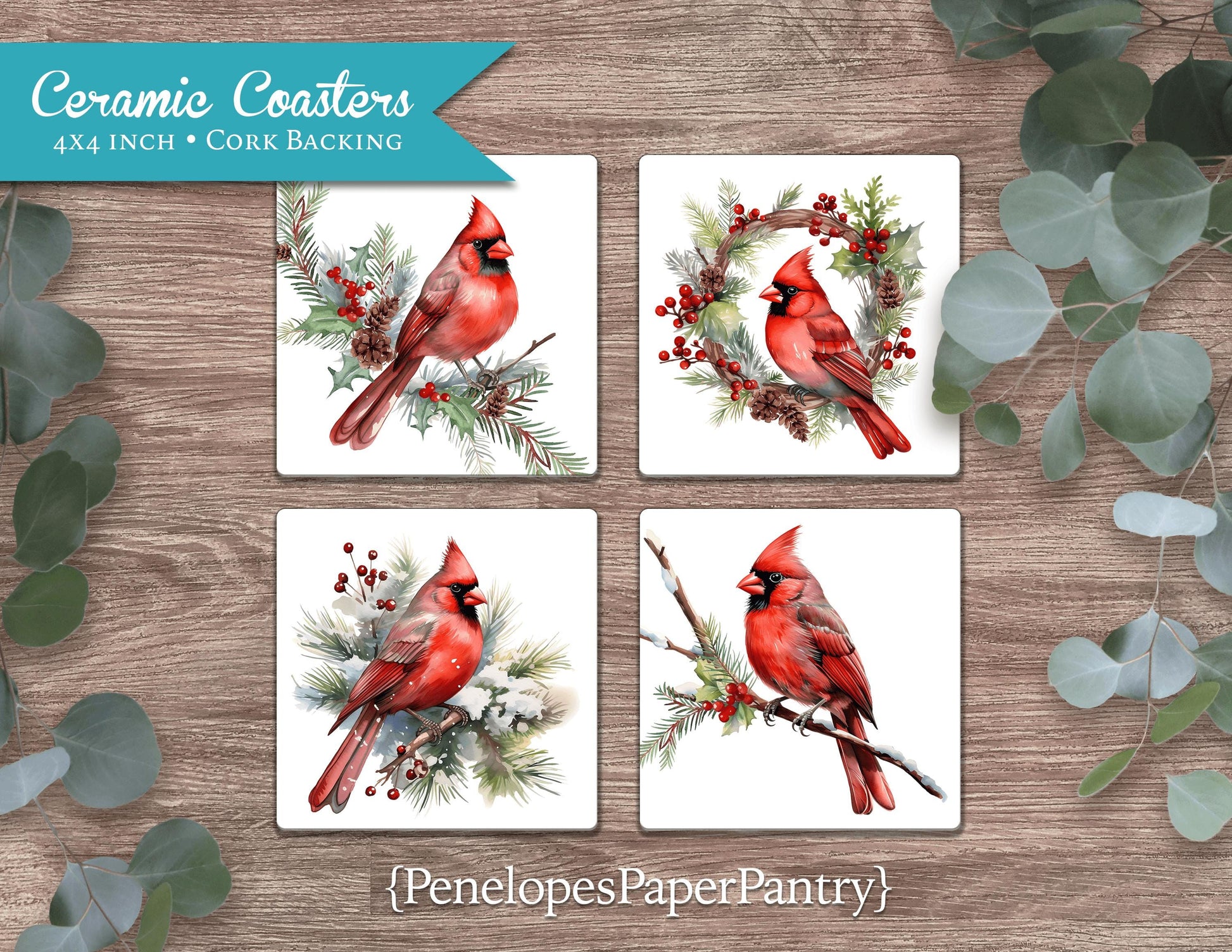 Red Cardinal Ceramic Coasters Set Of Four Christmas Decor Printed Winter Scene Gift For Her Gift For Him Cork Back Unique Stocking Stuffer