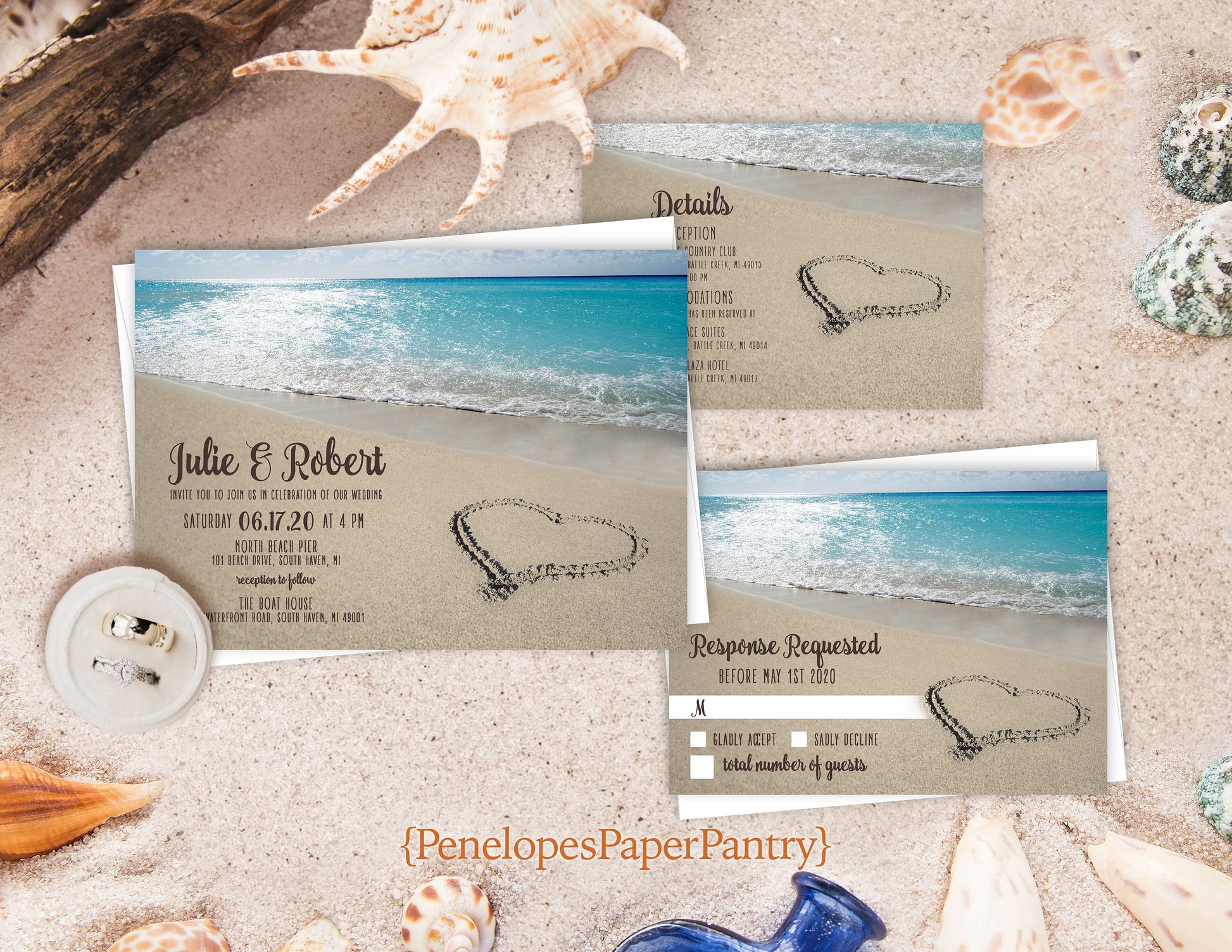 Romantic Beach Wedding Invitation Personalized Heart in the Sand Ocean Sunshine Destination Hawaii Printed Invitations Envelopes Included