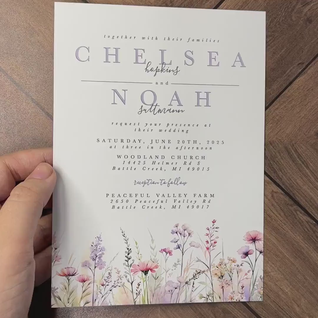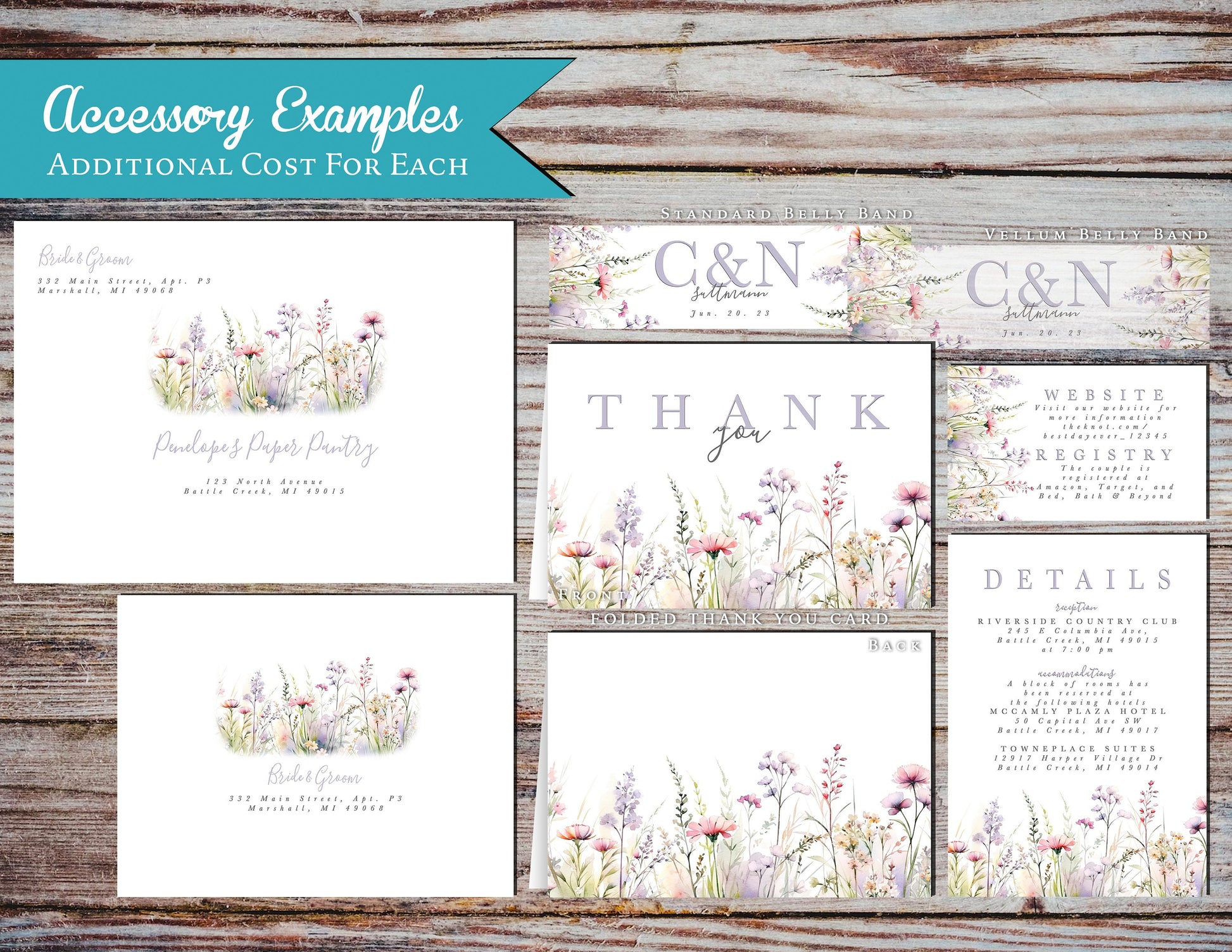 Romantic Pastel Wildflower Summer Wedding Invitation Personalized Lavender Blush Yellow Meadow Delicate Printed Invitation Envelope Included