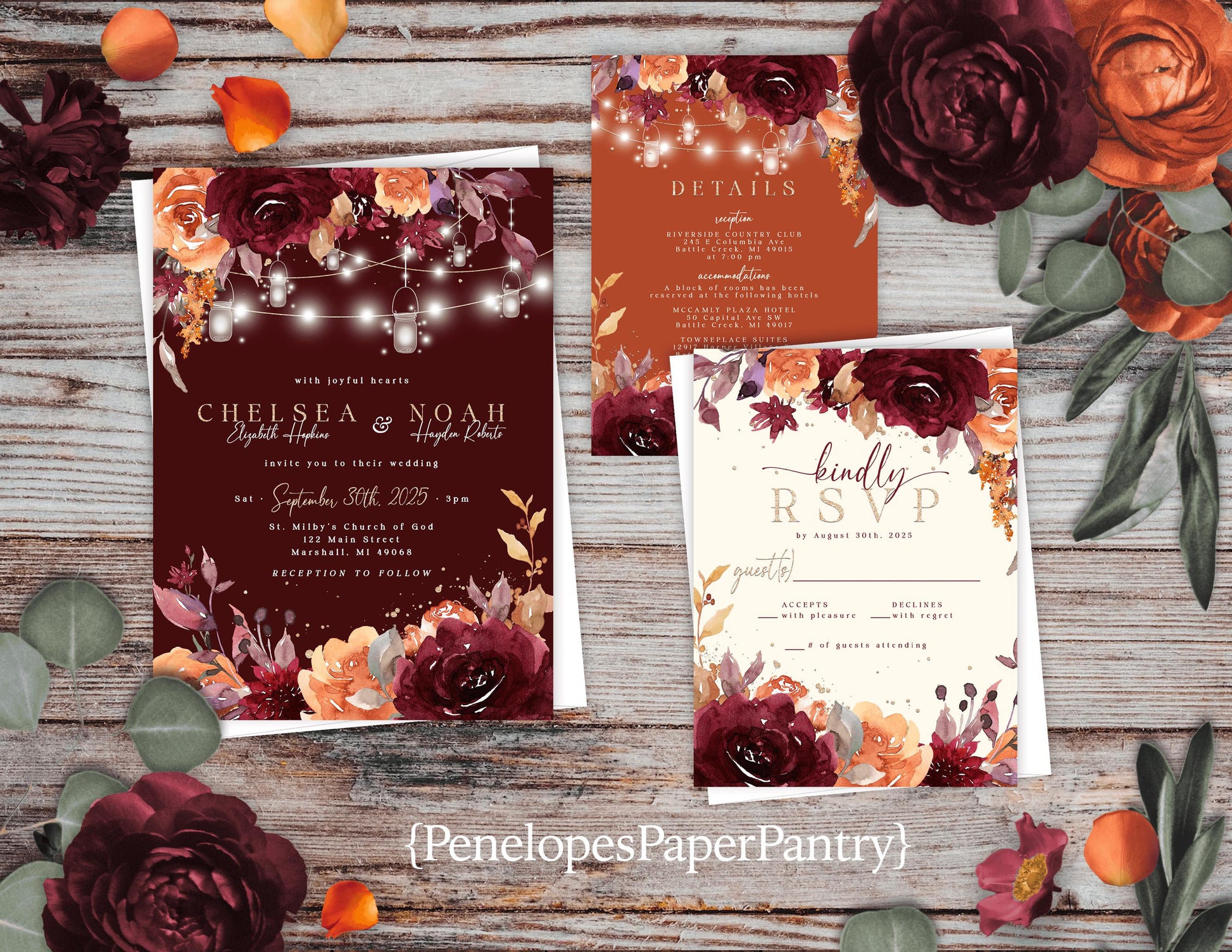 Romantic Rustic Burgundy Floral Fall Wedding Invitation Personalized Burnt Orange Barn Lights Satin Printed Invitations Envelopes Included