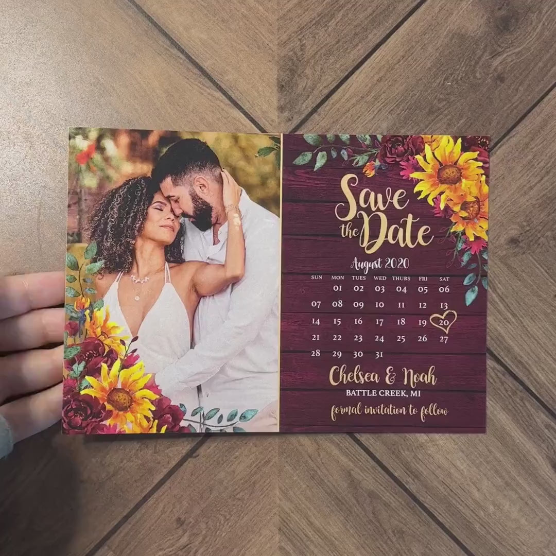 Save The Date Card Rustic Sunflower Fall Wedding Personalized Photo Calendar Burgundy Wood Gold Print Satin Printed Cards With Envelopes