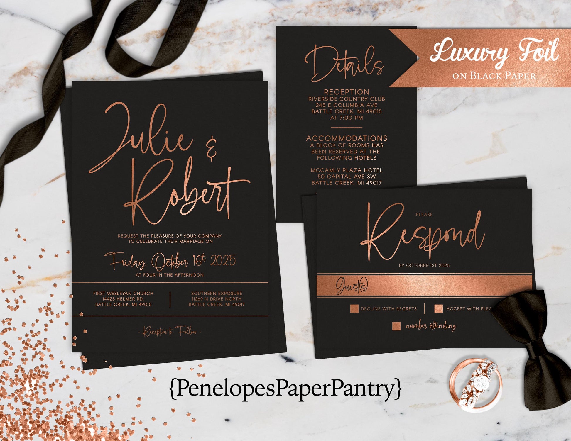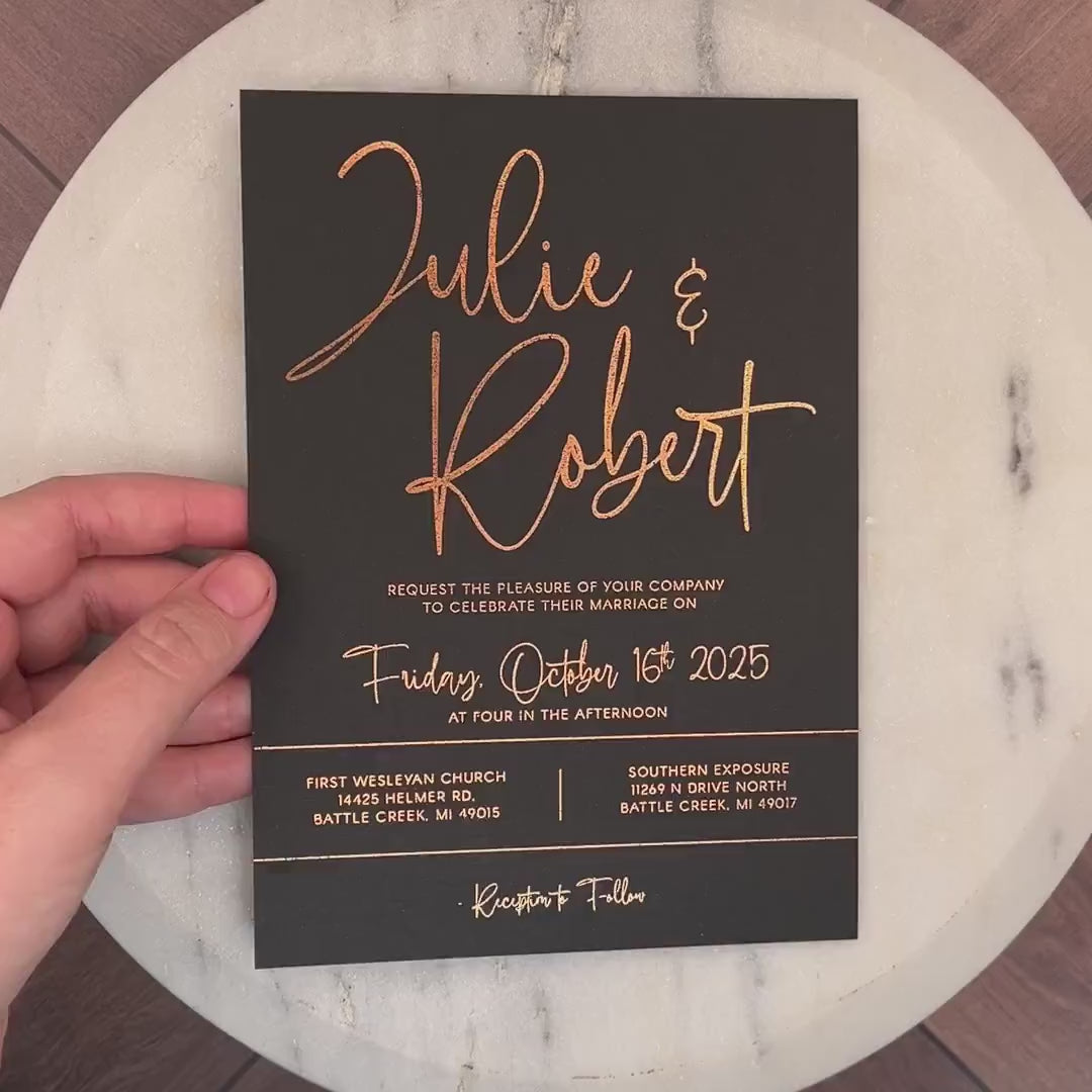 Modern Black and Copper Wedding Invitation Personalized Copper Foil Calligraphy Custom Text Formal Classic Elegant Printed Invitations Envelopes Included