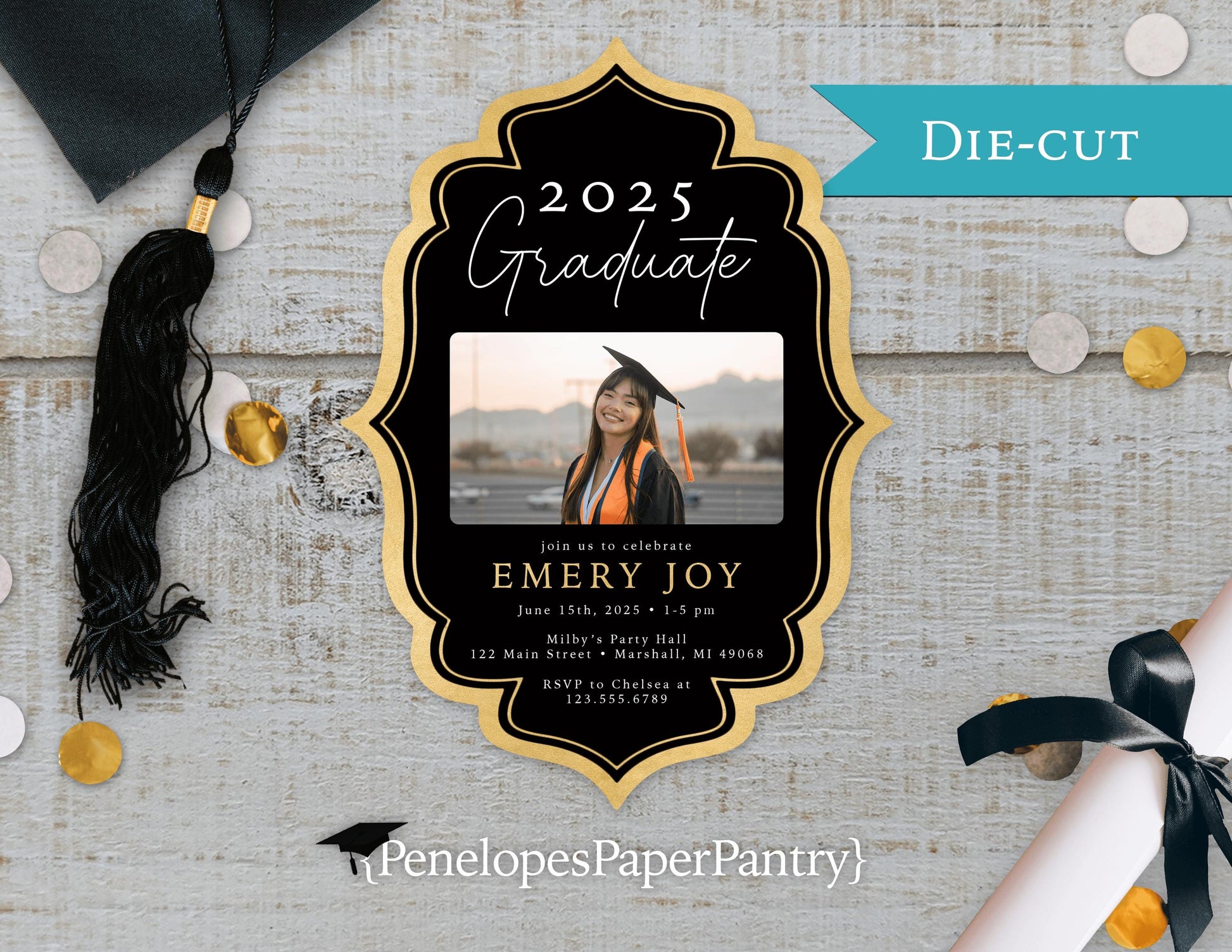 Die Cut Bracket Black with Gold Border Graduation Open House or Ceremony Invitation
