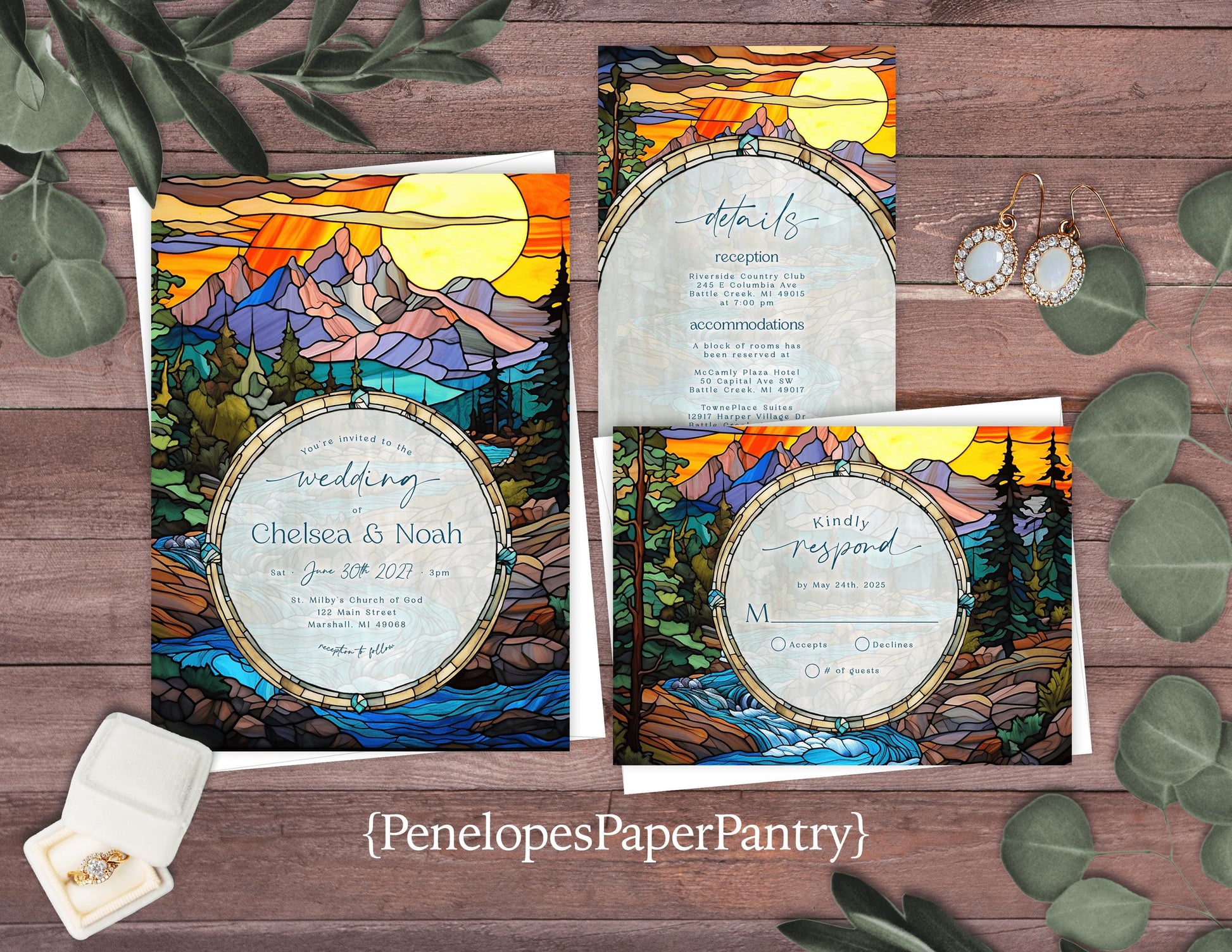 Unique Mountain Sunset Stained Glass Wedding Invitation Personalized Bright Colors Calligraphy Shimmery Printed Invitations With Envelopes