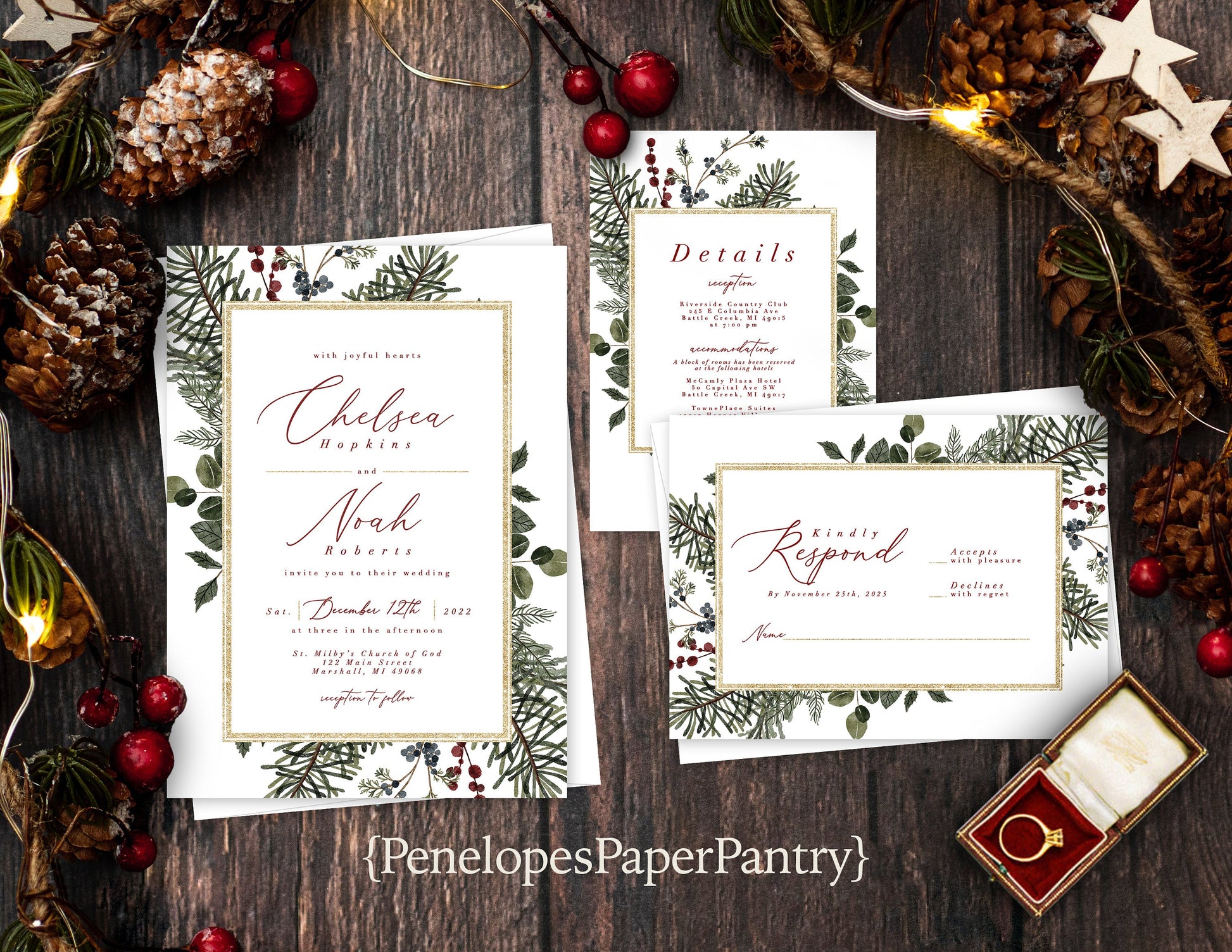 Celebrate your special day with timeless holiday charm using our Elegant Winter Wedding Invitation by Penelope’s Paper Pantry. This beautifully designed Christmas wedding invitation features classic greenery, rich red accents, and luxurious gold print calligraphy, all printed on shimmery premium cardstock—perfect for a formal winter wedding, holiday celebration, or romantic Christmas ceremony.